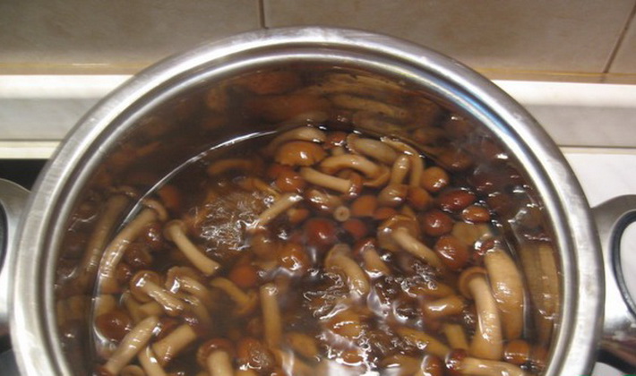 - Les champignons de miel sont nettoyés et bouillis pendant 20 minutes, puis rejetés dans une passoire pour les égoutter.