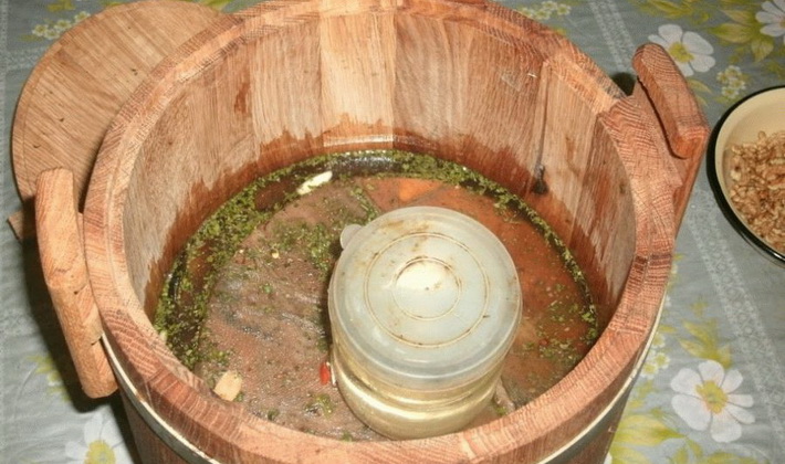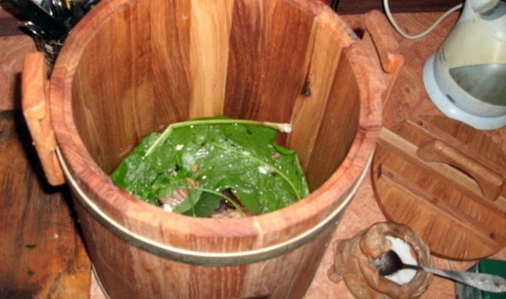 Au fond d'un récipient émaillé ou en bois, nous plaçons des feuilles de chêne, de cassis et de cerisier propres, saupoudrées d'une fine couche de sel.