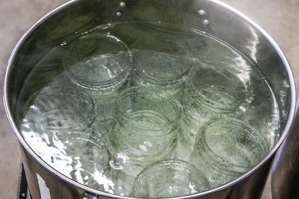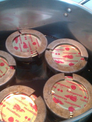 Les pots remplis sont recouverts de couvercles en verre afin que l'anneau en caoutchouc s'insère entre le couvercle et le goulot du bocal et recouvre complètement la partie supérieure (généralement rainurée) du goulot. À l’aide d’une pince ou d’un ressort, les couvercles sont bien serrés contre la boîte. Préalablement, dans une casserole, chauffez l'eau à 55-65 ° C et mettez les canettes scellées dans cette eau.