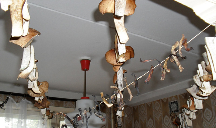 À la maison, vous pouvez faire sécher les champignons sur un poêle chaud, près du mur chaud d'un four russe ou hollandais, enfilés sur des fils ou de la ficelle. Avant de bien sécher les champignons porcini sur une ficelle, vous devez les nettoyer de la saleté, des morceaux et de la ficelle.