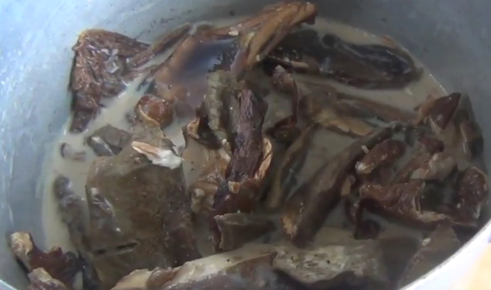 Champignons séchés Les champignons doivent être versés avec du lait et mis de côté pendant plusieurs heures pour gonfler.