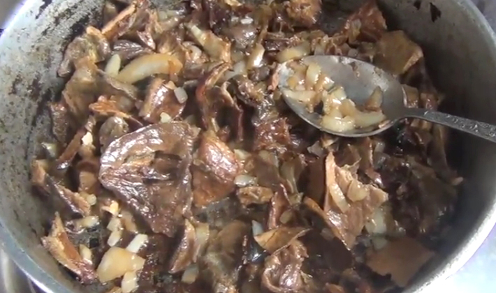 - Hacher et faire revenir l'oignon dans une petite quantité d'huile, le broyer dans un hachoir à viande et mélanger avec les champignons.