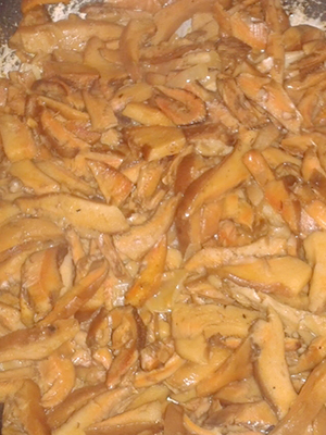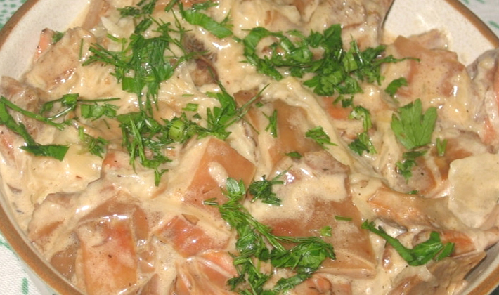 Faites frire jusqu'à ce que les pommes soient dorées et versez la crème sure mélangée au lait dans lequel les champignons ont été infusés.