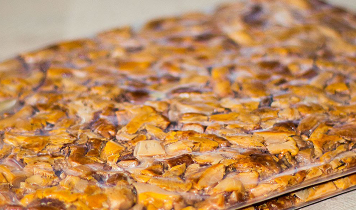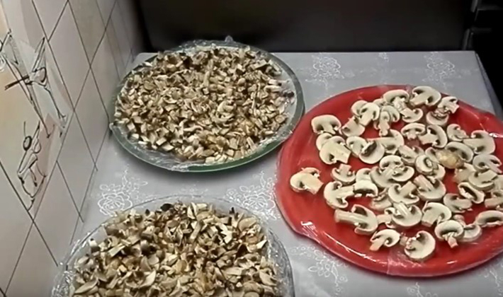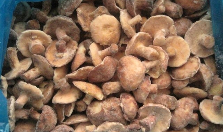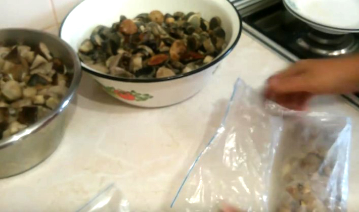 - Ensuite, les champignons filtrés sont frits pendant 30 minutes dans de l'huile végétale, après quoi ils permettent aux champignons de refroidir et sont placés dans des sacs en plastique par petites portions (environ 200 à 300 g) à usage unique; presser l'air hors des sacs.
