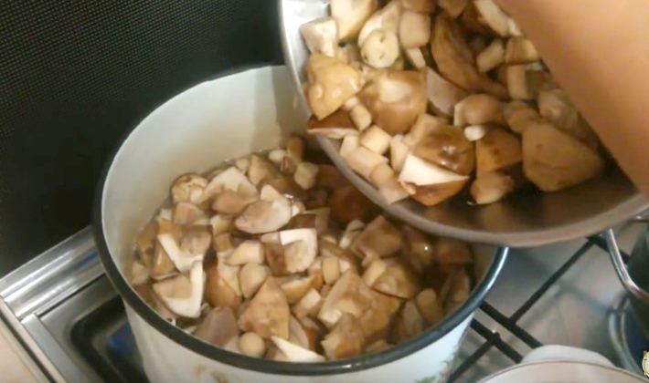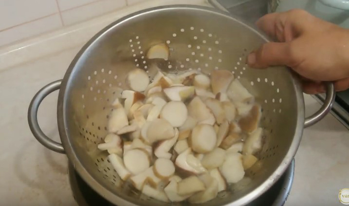 Les poitrines épluchées sont lavées à l'eau, coupées en morceaux, versées dans de l'eau bouillante salée et légèrement acidifiée, puis portées à ébullition pendant environ 5 minutes.