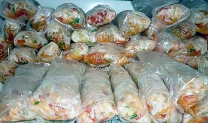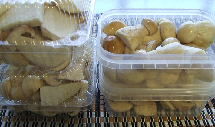 Les champignons surgelés sont disposés dans des sacs en plastique en portions (environ 200 à 300 g) à usage unique et l'air est comprimé des sacs.