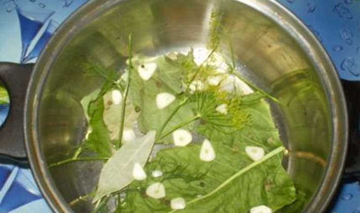 - En bas, nous répartissons la feuille de laurier, l'ail haché, l'aneth et les grains de poivre noir.