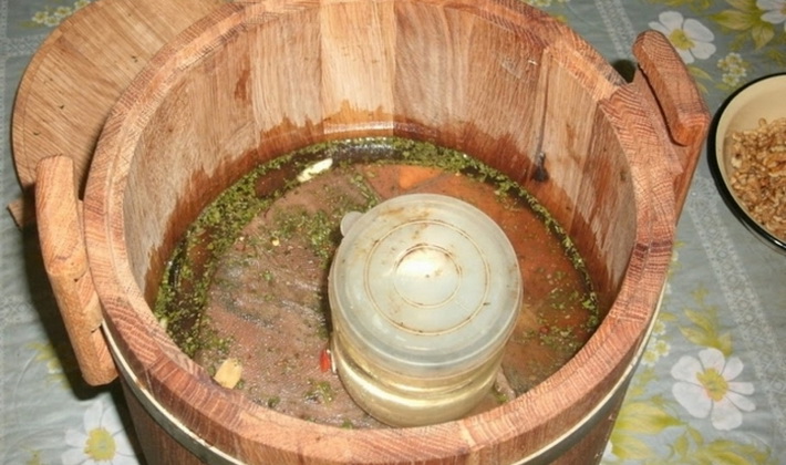 Si vous utilisez du salage à froid, il est préférable de le transporter dans des fûts en bois, des contenants émaillés ou en céramique. Ensuite, des collations presque finies peuvent déjà être disposées dans des bocaux en verre.