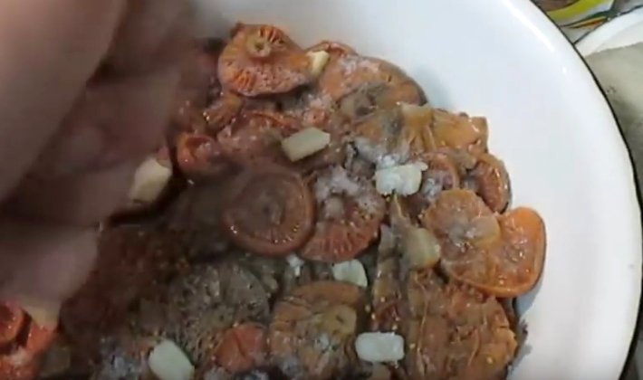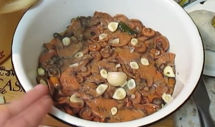 Une petite charge est placée et transférée dans un endroit frais pendant 5 jours afin que les champignons laissent passer le jus. Les champignons safran installés sous le pressoir doivent être complètement immergés dans la saumure. Si cela ne se produit pas, de l'eau bouillie froide est ajoutée à la pièce à usiner, ce qui permet de rétablir le niveau de liquide souhaité.