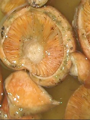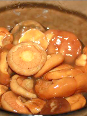 - Disposer les champignons bouillis en couches et les verser avec du sel, du clou de girofle et des pois.