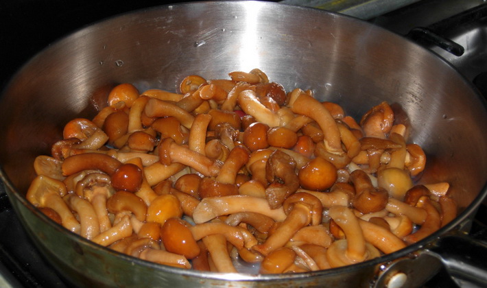 - L'huile est déposée dans une casserole bien chaude, les champignons au miel sont introduits et rôtis à feu moyen pendant 25-30 minutes.