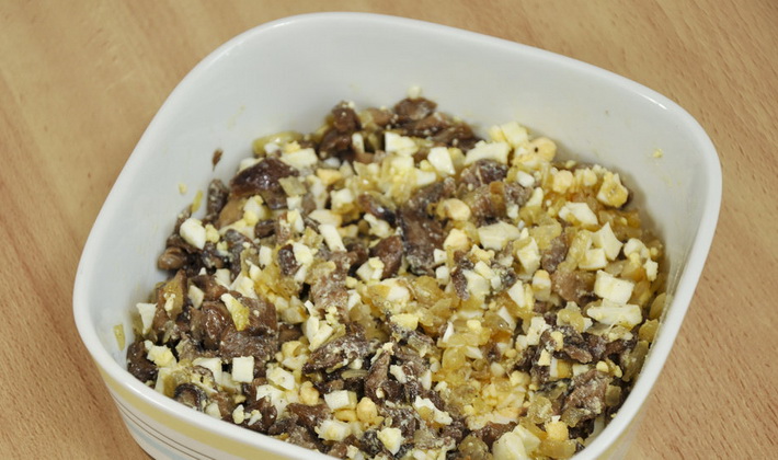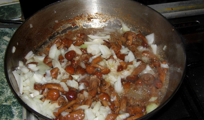 - Les oignons sont coupés en dés et ajoutés aux champignons, la masse entière est frite pendant 15 minutes en remuant constamment.