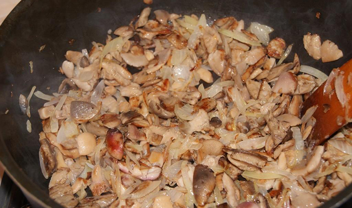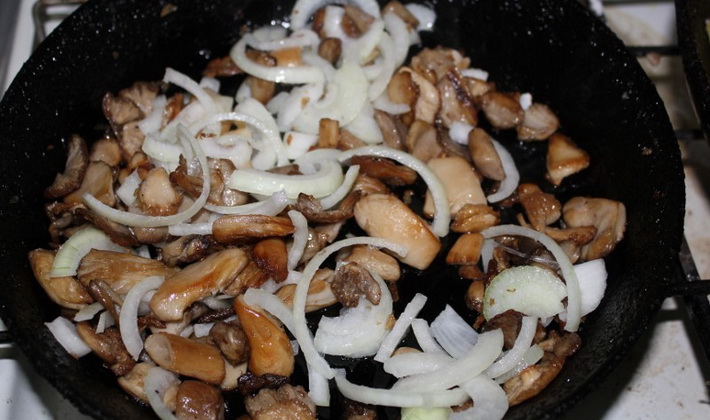 - Couper en morceaux 500 à 600 g de champignons et les faire frire avec une petite quantité de légume ou de beurre pendant environ 40 minutes, jusqu'à ce qu'ils renoncent complètement à l'excès d'humidité. Saler et ajouter des épices au goût.