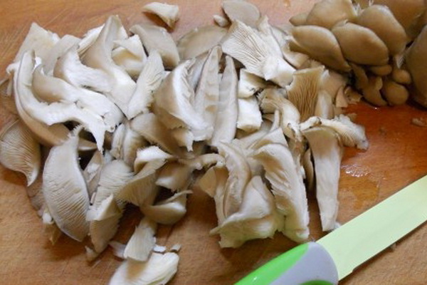 Les champignons à huîtres se désassemblent en champignons individuels, essuyez-les un peu avec une éponge humide et coupez le mycélium restant.