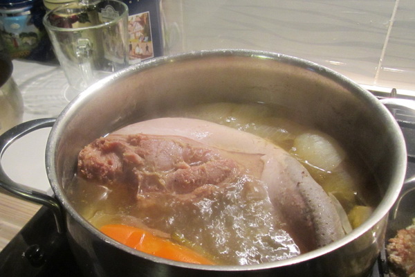 Lavez bien les langues, ajoutez de l'eau et faites cuire pendant une heure et demie.Vous pouvez ajouter du poivre noir et des feuilles de laurier à l'eau pour donner à la viande une saveur épicée. Piquez à la fourchette et mettez immédiatement dans l'eau froide, il est plus facile d'enlever la peau blanche. Couper en petits morceaux et mettre séparément dans une assiette.