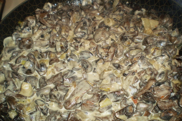 Verser la sauce dans les champignons, laisser mijoter pendant 5 minutes et mettre le lavrushka. Couvrir et laisser mijoter pendant 20 minutes.