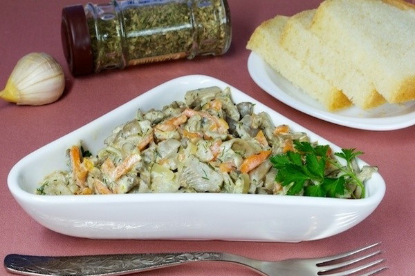 Les champignons à huîtres pré-nettoyés et bouillis dans de l'eau salée - 10 minutes. Égoutter, laisser refroidir et couper en gros cubes.