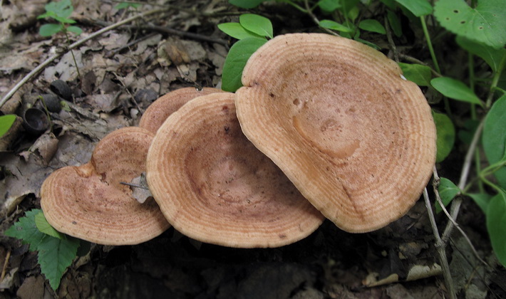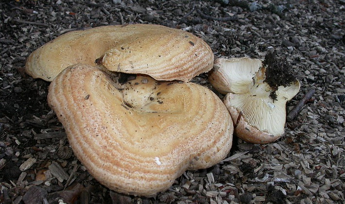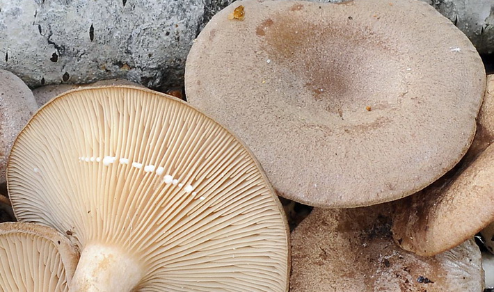 Similarité avec d'autres espèces. Par odeur: on peut confondre lactarius épicé ou fruité, gris rose, avec le chêne lactarius (Lactarius zonarius), qui se distingue par la présence de zones concentriques sur un chapeau brunâtre.