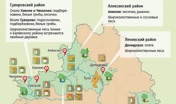 Des régions telles que Aleksinsky, Suvorovsky, Zaoksky, Belevsky, Arsenyevsky sont très riches en divertissement. Les forêts de ces territoires de la région de Toula sont toujours réputées pour leurs dons naturels de forêt. Il y a surtout beaucoup de champignons au safran, de girolles, d'écorce de bouleau et, bien sûr, de champignons au miel. Les régions les plus proches de Toula: Yasnogorsky, Leninsky, Efremovsky et Chernsky, sont également réputées pour leurs cultures de champignons. Ici, vous pouvez collecter plus d'un panier d'une variété de champignons.