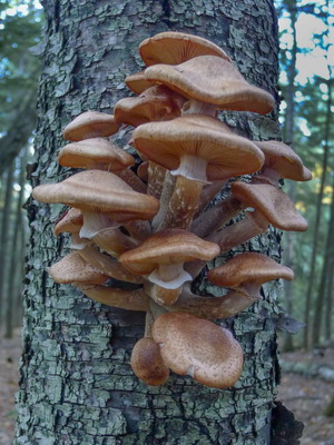 Bien que la croissance des champignons de chanvre ait déjà été notée, je tiens à montrer que l’espèce hivernale préfère s’élever très haut. C'est-à-dire que les champignons au miel choisissent leur lieu de croissance non seulement sur des souches, mais également sur des arbres, atteignant une hauteur pouvant atteindre 2 à 3 m.