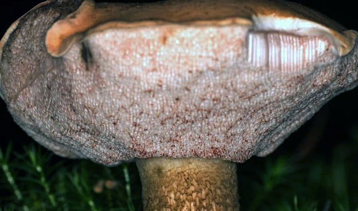 La couche tubulaire, de 1,2 à 2,5 cm d'épaisseur, est blanche chez les jeunes spécimens et devient ensuite grisâtre sale, avec des pores arrondis des tubules.