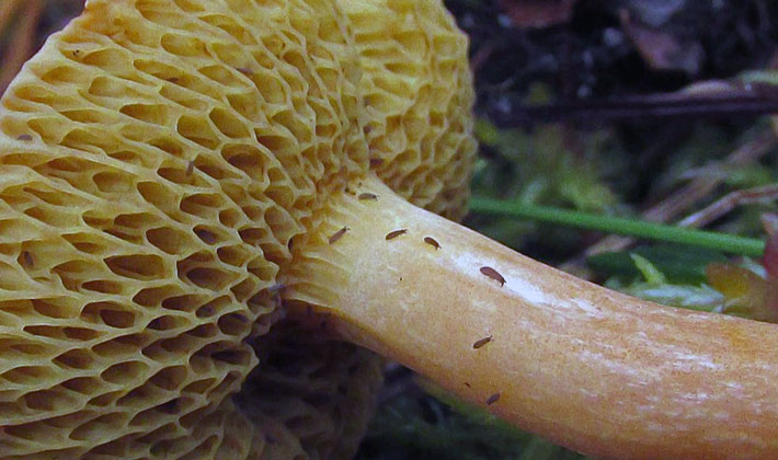 L'hyménophore est libre, entaillé, constitué de tubules de 1 à 2,5 cm de long, jaune citron, jaune or puis jaune brun. Une fois pressés, les tubes acquièrent une couleur bleu-vert. Poudre de spores couleur miel.