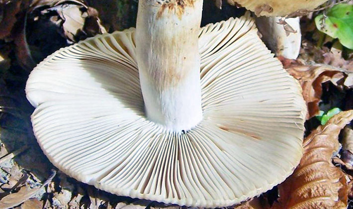 Les assiettes sont fréquentes, étroites, descendant fortement le long de la jambe, d'abord blanchâtres, puis plus blanches. La poudre de spores est blanche.