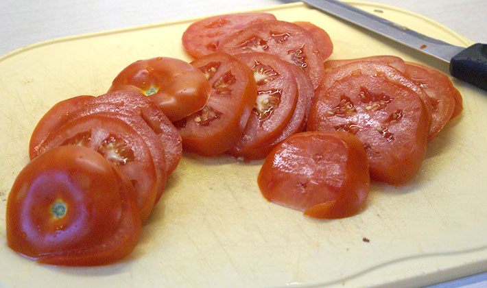 Décorer le plat avec les tranches de tomates restantes.