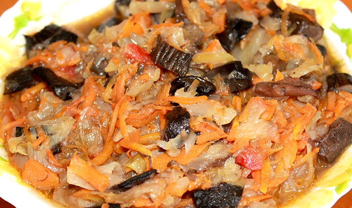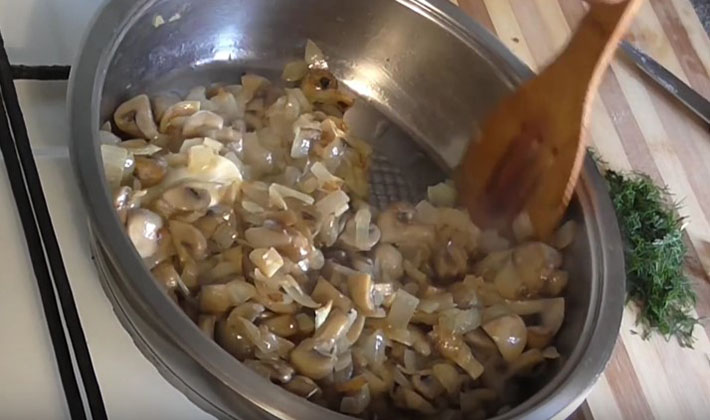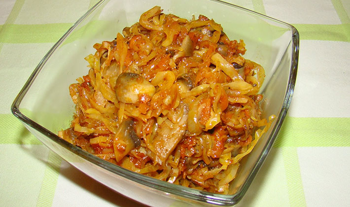 - Mettez les champignons dans une poêle avec de l'huile végétale réchauffée, ajoutez le chou, les pommes de terre, les oignons, le sel, ajoutez un peu d'eau et laissez mijoter jusqu'à cuisson complète.