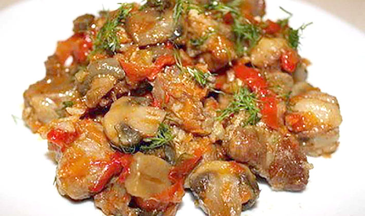 Méthode de cuisson: épluchez la viande, coupez-la en tranches, salez, poivrez et faites-la frire dans une poêle bien chaude des deux côtés. Séparément, faites frire les champignons, les oignons et les tomates cuits. Faire bouillir et faire frire les pommes de terre, puis mettre la viande dans une casserole, y mettre les champignons, les oignons et les tomates, et ensuite les pommes de terre frites, verser la crème sure et saupoudrer de fromage râpé. Mettez au four pour la cuisson. Avant de servir, saupoudrer de persil. Assurez-vous de servir sur la table dans une casserole.