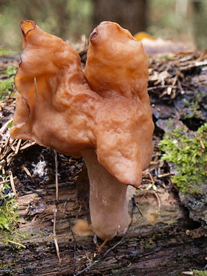 Cerf Trick (Pluteus cervinus) et ligne d'automne (Gyromitra esqulenta) poussent également sur du bois mort et des souches délabrés.