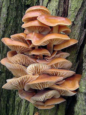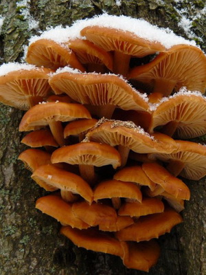 Dans le jardin, sur les bûches, vous pouvez également élever des champignons d’hiver. L'agaric de miel d'hiver (Flammulina velutipes) est un champignon comestible, savoureux et apaisant. Vous pouvez même le manger cru. Le plus volontiers, il pousse sur des morceaux de bois de saule, sur des souches de saule. Il est possible de faire pousser des champignons et du miel sur des bûches de bouleau. Les corps de fruits se forment non seulement sur l'écorce des rondins, mais aussi à l'extrémité. Il porte ses fruits à la fin de l'automne et même en hiver lorsque les températures sont favorables lors du dégel. Il y a des cas connus de fructification du Nouvel An sous la neige. Sous le microscope, vous pouvez voir comment les cellules de mycélium de champignon d'hiver éclatées et congelées commencent à se développer lorsque la température dépasse zéro.