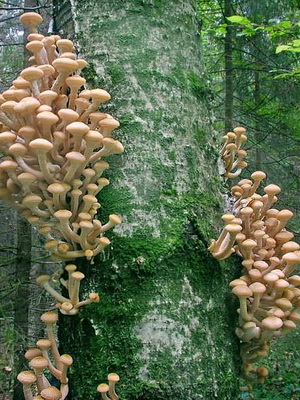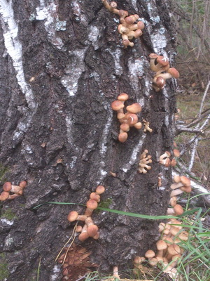 Nous vous proposons de voir une photo de champignons au miel sur un bouleau, montrant visuellement comment se développent ces fructifications. La quasi-totalité d'entre eux sont des saprophytes dans la nature, c'est-à-dire des parasites qui détruisent les restes de représentants vivants du monde végétal.