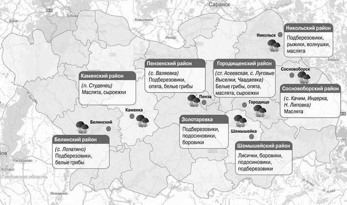 Ceux qui vivent plus loin du centre régional peuvent visiter les forêts du district de Penza, près du village de Valyaevka, ou du district de Sosnovoborsky, près des villages de Kachim, Inderka ou N. Lipovka. En plus des champignons au miel, il existe dans ces territoires beaucoup de beurre, de cèpes, de champignons safran, de cèpes bruns et de russula.