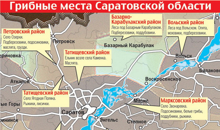 Nous souhaitons partager avec vous des informations vous permettant de cueillir des champignons et d’autres champignons dans différentes régions de la région de Saratov. Par exemple, dans le district de Balti, près du village d’Alekseevka, il n’ya pas que des champignons d’automne dans la forêt. Les cèpes, les cèpes et le miel sont abondamment récoltés. Dans le district de Krasnoarmeysky près d'Ivanteyevka, vous pouvez également trouver des champignons, des champignons et des champignons.
