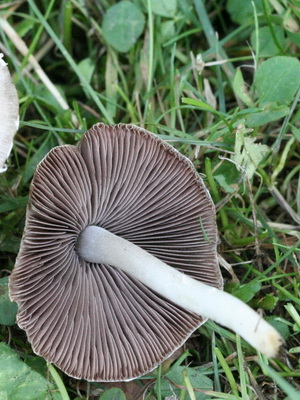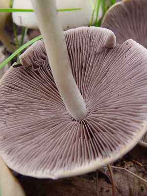 Records: étroit, dense et collé à la jambe. Les jeunes spécimens ont une couleur blanchâtre sur les plaques qui, en cours de croissance, se change en gris violet, puis en brun foncé.