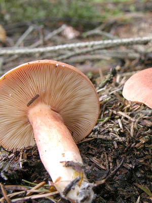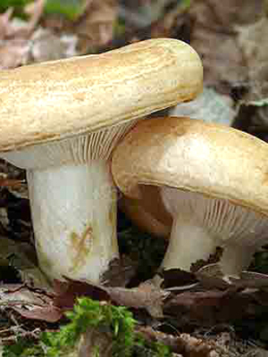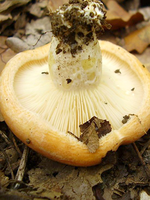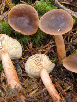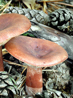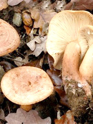 Un chapeau avec un diamètre jusqu’à 10 cm, d’abord convexe ou plat avec un bord incurvé, légèrement déprimé, plus tard en forme d’entonnoir, avec des zones concentriques visibles, ocre de brique, brun-rougeâtre. Les plaques sont fréquentes, légèrement descendantes, ocre pâle, avec l'âge dans les taches de rouille brune. La pulpe est blanche, avec la croissance du champignon acquiert une teinte rougeâtre. Le jus laiteux n'est pas abondant, légèrement amer, blanc aqueux, ne change pas de couleur à l'air. Jambe atteignant 10 cm de haut, solide, creuse, cassante, même ou courbée dans le vieux champignon, de même couleur avec un chapeau, roux-rouillé à la base. Il se développe en petits groupes dans les forêts de feuillus et mixtes avec un mélange de chêne, autour de chênes d'âge moyen dans les herbes basses et sur la litière de forêt, et forme des mycorhizes avec du chêne. Forme les fructifications en juillet - octobre.