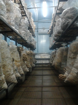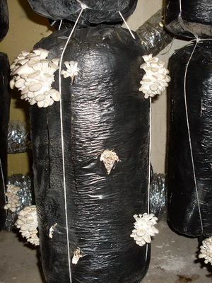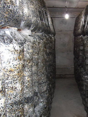 La technologie utilisée pour forcer les champignons chez AGC Moskovsky était extrêmement simple. Le substrat préparé dans les tunnels de pasteurisation a été mélangé avec du mycélium (3%) et versé dans des sacs en plastique de 20 kg de substrat chacun. Les sacs pour la culture des pleurotes ont été attachés, perforés de leurs couteaux sur la surface latérale et transportés pour incuber dans un magasin de légumes en béton vide ou dans une salle de stockage d'une superficie maximale de 800 m2. Les sacs ont été placés sur le sol à intervalles rapprochés et la température de l'air a été portée à + 5 ... + 10 ° C au moyen d'appareils de chauffage portables. Après cela, les blocs de substrat, se réchauffant, aident les chauffages. La température de l'air dans les serres de champignons pour les champignons d'huîtres a été maintenue dans la plage de + 20 ... + 28 ° С en fonction de la température du substrat à l'intérieur des blocs, qui ne devrait pas dépasser 35 ° С. Après 20-25 jours, les blocs envahis par le mycélium ont été transportés pour forcer les champignons dans la serre.