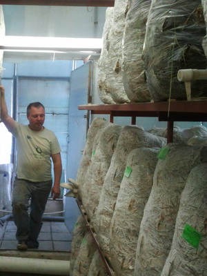 Après le chargement, le tunnel est fermé et la ventilation de recirculation est activée pour équilibrer la température dans la masse du substrat. Puis commencez à ajouter 1% d'air frais. En hiver, pour le chauffage initial du substrat pour la culture des pleurotes, la vapeur est fournie par le bas avec l'air. Après un certain temps, l'activité microbiologique commence à augmenter dans le substrat.Le substrat commence à se réchauffer et à maintenir la température de pasteurisation, de moins en moins de vapeur et plus (jusqu'à 5%) d'air frais sont nécessaires. La température est élevée lentement, le chauffage du substrat prend 12 heures en été et jusqu’à 24 heures en hiver. Le générateur de vapeur doit fournir 25 kg de vapeur par heure pour chaque tonne de substrat.