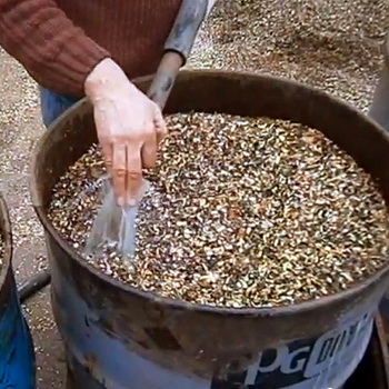 Dans la zone climatique moyenne de la Russie, il est plus rationnel d'utiliser du bois de chauffage de bouleau et de tremble. Dans une ferme de champignons dans la région de Volokolamsk, les pleurotes sont cultivés avec succès sur du tremble cuit à la vapeur. Les troncs de bois dont le diamètre ne dépasse pas 20 cm sont broyés dans un concasseur en petits copeaux d'une taille de 10 à 30 mm. Le bois de chauffage plus épais doit être coupé en plusieurs parties avant d'être broyé. La teneur en humidité naturelle du bois de chauffage est comprise entre 40 et 50%. La teneur en azote dans le bois n'est que d'environ 0,1%. Par conséquent, dans le substrat, des grains d'avoine ou d'orge sont ajoutés en plus à raison de 20% en poids de bois. Le traitement thermique et le mélange sont effectués dans une machine à substrat, qui est un fût tournant sur l'axe. Vous pouvez facilement y charger des copeaux de bois et des céréales, y verser de l'eau, appliquer de la vapeur et mélanger le tout.