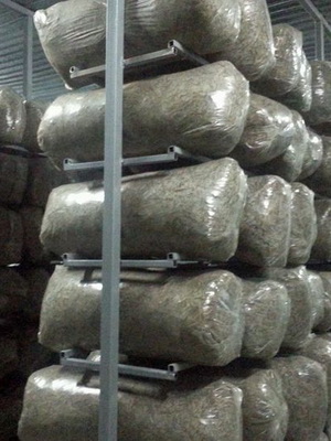 Lors de la culture de champignons pleurotes dans une pièce à flux d’air laminaire, les racks de pose des blocs doivent être conçus de manière à ce que ceux-ci soient alignés verticalement sous la forme d’un mur continu. La distance entre les murs est de 1 m. La distance entre les niveaux en hauteur est de 70 cm. Pour éviter que les blocs ne tombent en direction du couloir, une barre de renforcement amovible est placée sur les crochets au niveau du milieu des blocs. Les racks verticaux doivent être installés tous les demi-mètres sur toute la longueur du rack. Chaque support, lors de la culture de pleurotes dans une pièce à flux laminaire, est fixé au sol par au moins deux chevilles métalliques et deux autres au plafond. D'un côté de la crémaillère, des barres de renforcement sont soudées aux supports, de l'autre elles sont placées sur des crochets soudés aux supports. Au moment de la mise en place des blocs de substrat, la barre correspondante est retirée et placée temporairement sur un autre niveau.