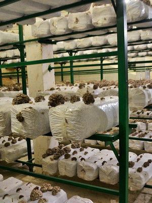 Un ventilateur d'extraction d'une capacité de 5000 m3 / h est monté dans la paroi de la chambre opposée à la fenêtre. Les ventilateurs se mettent en marche toutes les demi-heures pendant 5 minutes. En été, le système fonctionne bien et vous permet d'obtenir des champignons de bonne qualité. En hiver, il est nécessaire de limiter l'alimentation en air en raison d'une puissance insuffisante du système de chauffage. En hiver, lors du fonctionnement des ventilateurs d'extraction, de l'air frais givré pénètre par la fenêtre. Cependant, les champignons n'ont pas le temps de geler et de bien pousser. Pendant l'incubation du mycélium, les fenêtres sont fermées, les ventilateurs d'extraction ne fonctionnent pas. Ils ouvrent les fenêtres et activent brièvement les ventilateurs d'extraction si la température au centre de l'appareil dépasse les 35 ° C. Ensuite, la température dans la chambre est maintenue de +13 à +20 ° C. La productivité pour deux vagues de fructification atteint 20% de la masse du substrat.