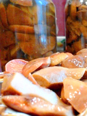 Après que les champignons aient été placés dans des bocaux en verre et remplis de saumure, ils sont versés sur plusieurs cuillères à soupe d’huile végétale calcinée. Cette méthode ne permettra pas à la moisissure de s'étendre sur la surface de la pièce à usiner, ainsi les champignons ne se détérioreront pas.