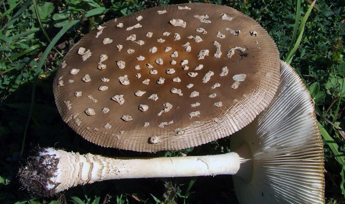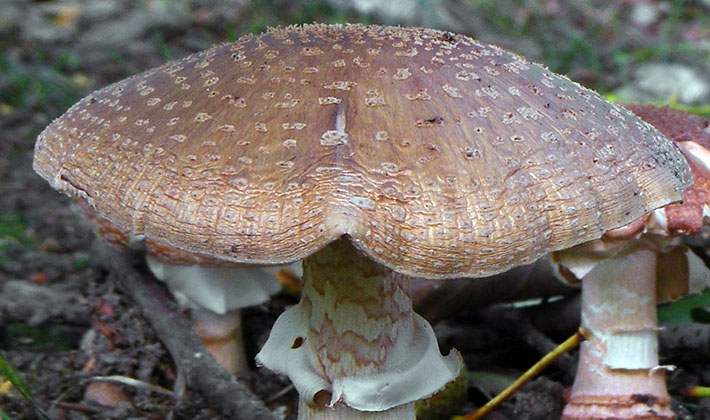Le chapeau a un diamètre de 5-15 cm, parfois jusqu’à 18 cm, d’abord sphérique, puis convexe et convexe-prostrée. L’espèce se distingue par son chapeau brun rosé comportant de nombreuses taches grises ou rosées de grandes échelles, ainsi que par une jambe gris-rose avec un anneau à bords pendants et un épaississement à la base, ceinturé par les restes d’une volve.