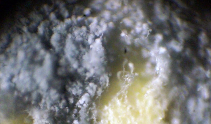 Moisissure jaune affecte également souvent les champignons. Elle est causée par un champignon parasite, Myceliophtora lutea; cet agent pathogène est l’un des plus dangereux pour les champignons. Un tel champignon peut être trouvé dans la nature - il parasite le mycélium sauvage de divers champignons. Et dans le substrat, il ne se développe que s'il y a aussi du mycélium champignon. Un mycélium blanchâtre apparaît à la limite entre le matériau de revêtement et le substrat. Après quoi les spores se forment et les zones touchées deviennent jaunes. Le substrat lui-même commence à sentir une odeur d'oxyde de cuivre ou de carbure. Les spores du champignon sont très résistantes aux températures élevées, elles ne meurent pas pendant la pasteurisation et peuvent être transportées avec la terre infectée par le substrat par les mains des personnes et des outils.
