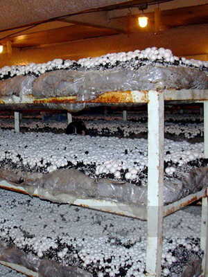 Avant de faire pousser des champignons au sous-sol, vous devez acheter du compost «en vrac», ensemencé de mycélium, prêt à être incubé. Vous l'amenez à la succession et le mettez vous-même dans des sacs ou sur des étagères. Ensuite, le mycélium développe du compost dans la salle de culture. Après cela, il est nécessaire de remplir le sol tégumentaire, d'attendre qu'il pousse avec du mycélium et, enfin, d'obtenir les champignons.