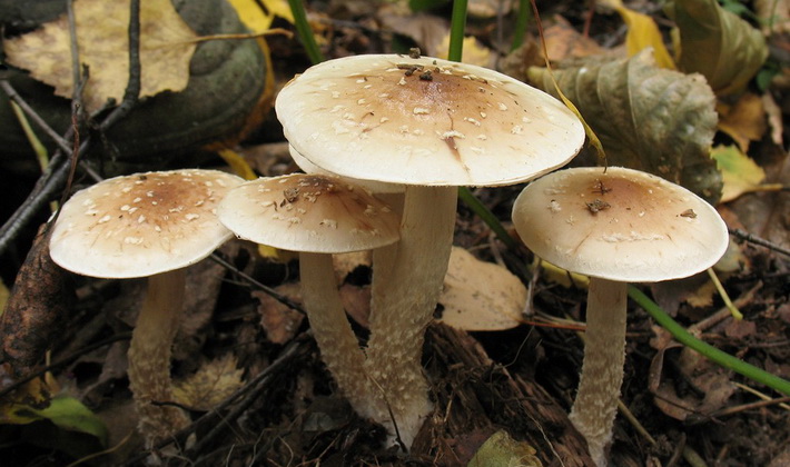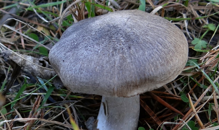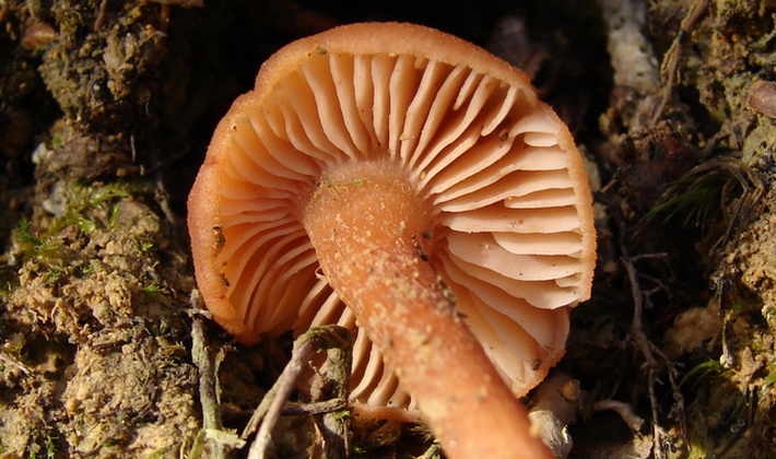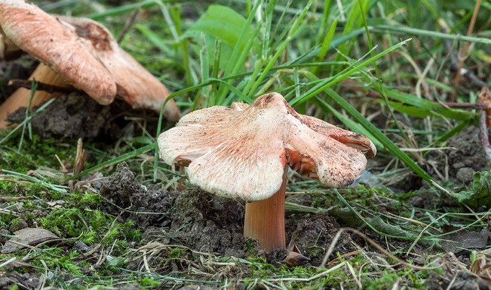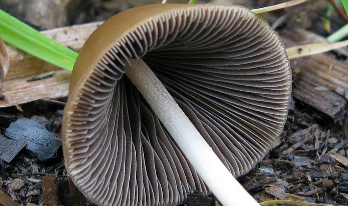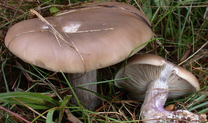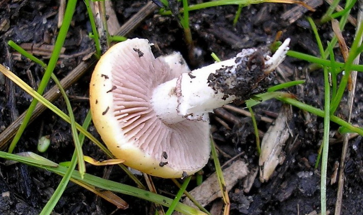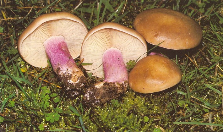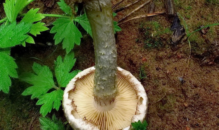 Jambe de même couleur avec un chapeau, forte, légèrement épaissie à la base, avec rainures longitudinales, lamelles très fréquentes, pas larges, roses, puis brunes, blanches sur les bords et recouvertes de duvet.