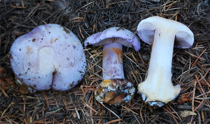 La chair est dense, violet pâle, plus tard plus douce, ocre-crème, avec une légère odeur d'anis.Les lamelles sont fréquentes, minces, dentées ou presque libres, violettes.