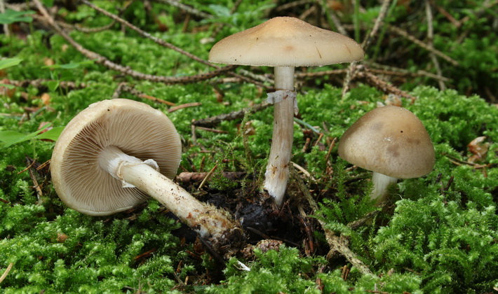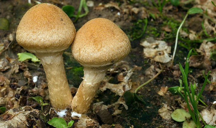 Le chapeau de jeunes champignons est hémisphérique ou conique, avec un voile privé dense gris-ocre. L'anneau est courbé, large, membraneux.