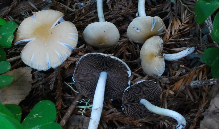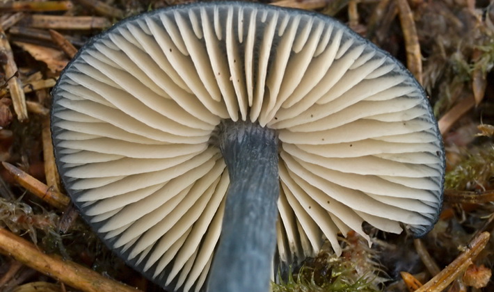 Le pédicule est cylindrique, blanchâtre, légèrement jaunissant, fréquent, envahi par la végétation, blanchâtre. Les lamelles sont étroites, fréquentes, envahi par la végétation, blanchâtre.